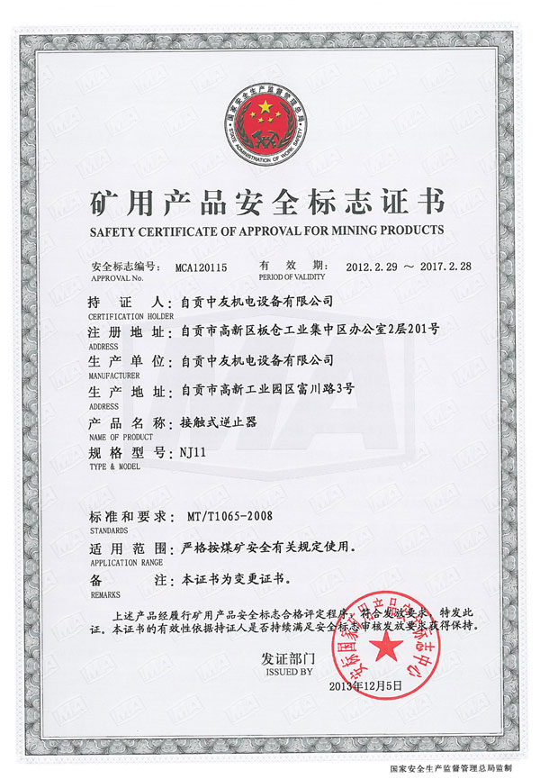 礦用產(chǎn)品安全標(biāo)志證書(shū)